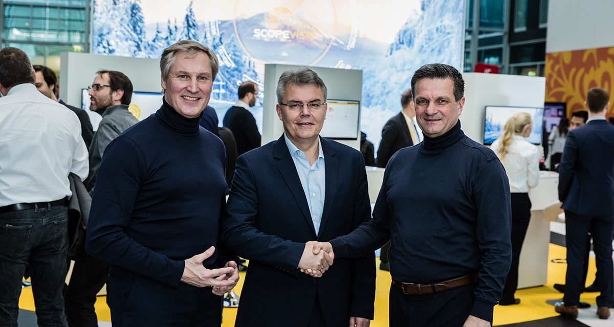 Bildunterschrift: Dr. Jörg Haas (Gründer Scopevisio AG), Christof Kurz (Geschäftsbereichsleiter eurodata AG), Michael Rosbach (Vorstand Scopevisio AG), v.l.n.r. (Copyright: Scopevisio AG/Foto: Simon Hecht)